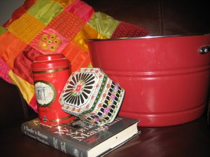 I am cheating including the pillow in the background. It was a thrifty find, but I found it months ago. I thought it added some needed colour. Can you see the trend? More red! I just about knocked some poor man over when I spied the red metal tub. Got it for $5.00 and it still had a price tag on the bottom from Pottery Barn – $59.00 ! Score!