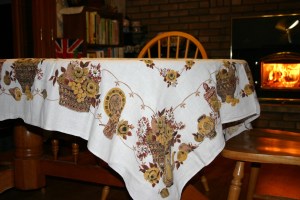 I did find this great vintage tablecloth. Nice colours and in great shape!