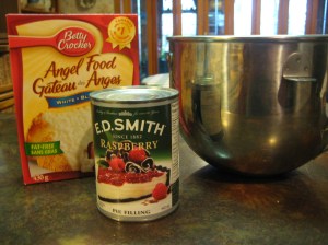 So another Pinterest cake. You can’t really call it a recipe when it is only 2 things. The idea and picture on Pinterest is for an apple cinnamon cake. I didn’t have apple pie filling in a tin, so I substituted raspberry. And that is it Angel Food cake mix and a tin of pie filling mixed together. I have heard you can also use crushed pineapple instead of the pie filling.