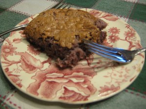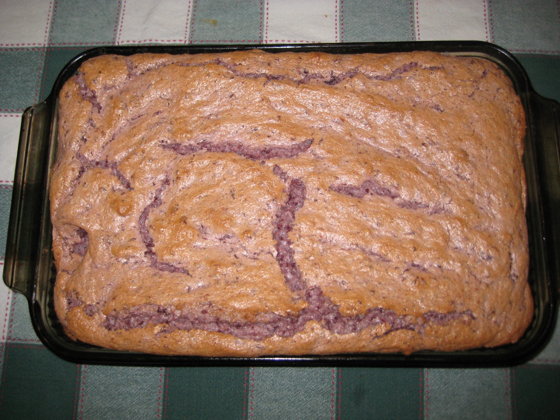 It was not really pretty and almost as soon as I took the picture it kind of deflated. The flavour is good, very strong raspberry. The texture is …sticky and there are the seeds… The whole thing shrunk away from the edges of the pan and it is a bit heavy. So, not the nicest cake to take to a potluck. But I am thinking if you cut it into chunks and made it into a trifle it would be lovely. Anything is improved by the addition of Birds custard. I should have made some. Also I think the apple version would be better, more of a breakfast cake. Should those words even be together?