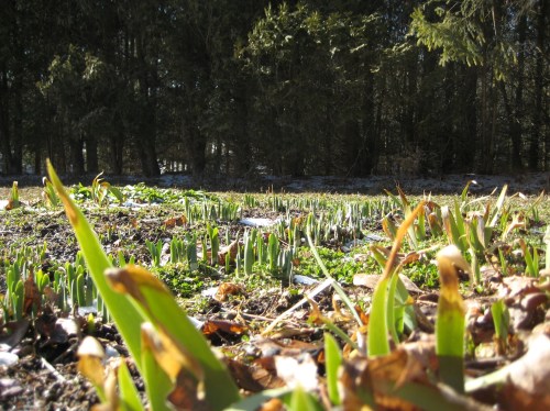 Saturday was not as warm as I would have liked, but in the afternoon I did get outside to poke around in the gardens. Yes spring is on the way and wow there are more bulbs here than I thought! I can also start to see the shapes of gardens. Some are obvious, but others are at the end of the huge vegetable garden. There are clearly paths and clump after clump of bulbs.