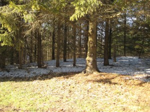 Still snow under the pine and cedar trees.