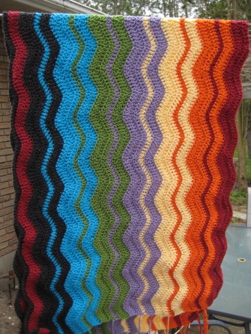 Then I managed to make it to the end of the first colour repeat on the ripple afghan. Now I start back into the black and repeat the stripe pattern. I think 3 or 4 repeats will make a huge and cozy afghan to cuddle under next winter. I am even getting to like the crazy, shocking colour scheme.