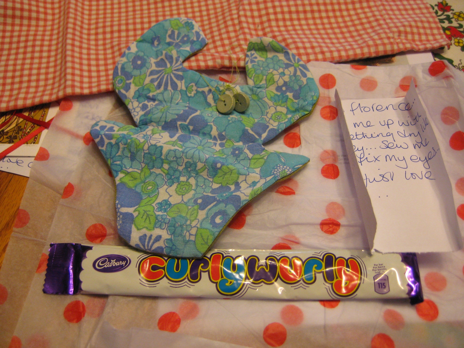 A froggy named Florence who just needs a bit of beans and a couple of eyes sewn on. Cass even included the buttons for the eyes! I remember making these froggies myself when I was younger. They are a great fun sewing project. I must dig mine out and introduce Florence I hope they understand her accent! I love the vintage print she used. Plus a curly wurly bar, it is a chocolate covered carmel candy bar. (and it was tasty!)