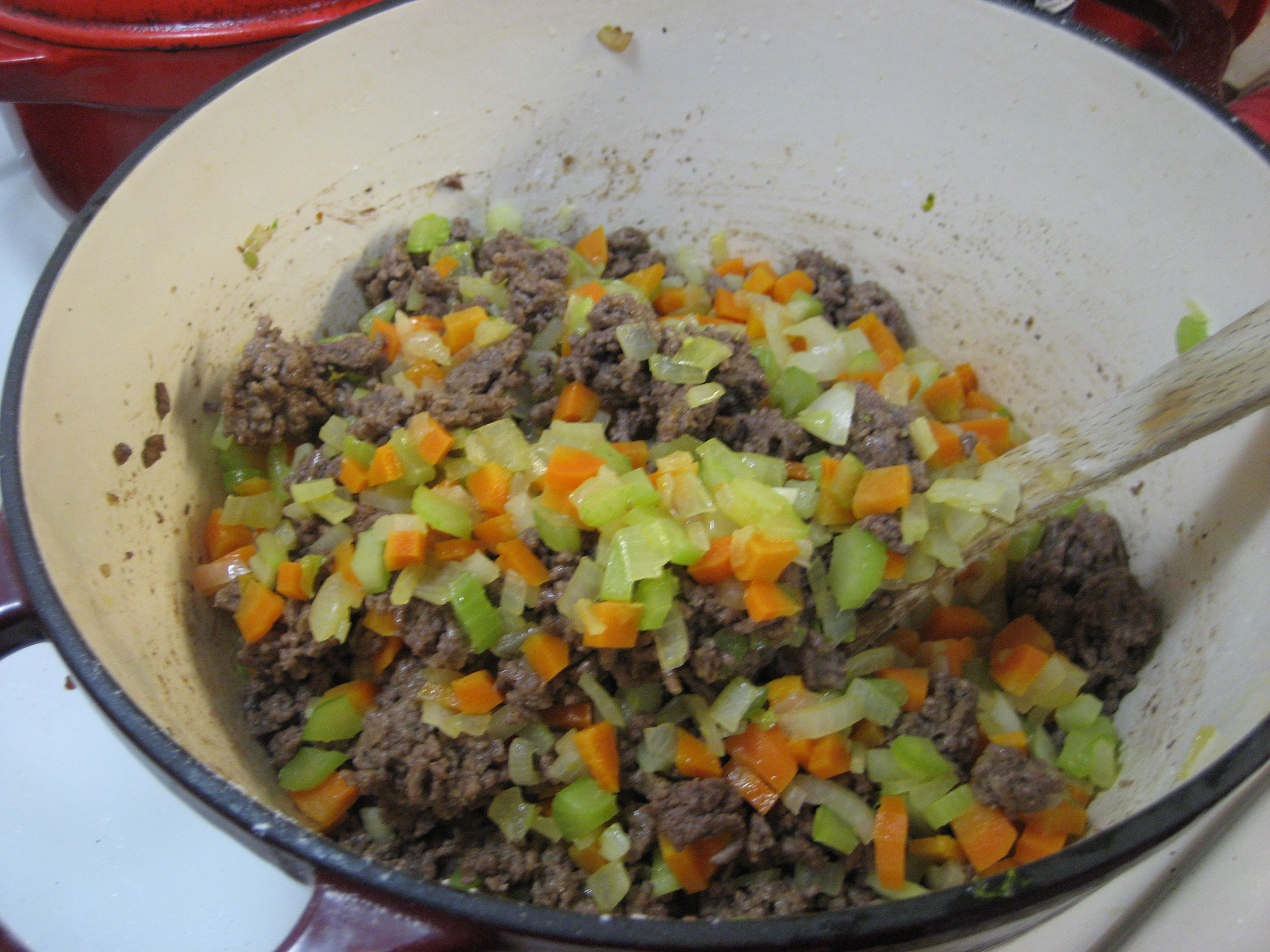 For the filling I finely chop about 1 cup each of onion, celery, and carrot and saute until soft. Remove to a bowl. in the same pot saute 3 or 4 lbs of ground beef. Add some salt pepper and 1 teaspoon of garlic powder. After the beef is browned stir in 1/4 cup of flour to absorb the excess fat, stir to cook.
