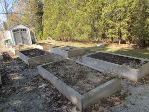 The six main raised bed gardens are looking a bit forlorn. we added lots of compost and mulch in the fall and I’m hoping they are in good shape for planting. I have some ideas about extending a small in-ground bed to the front of this photo to add some larger space crops like squashes. another bed is to be converted to more herbs.