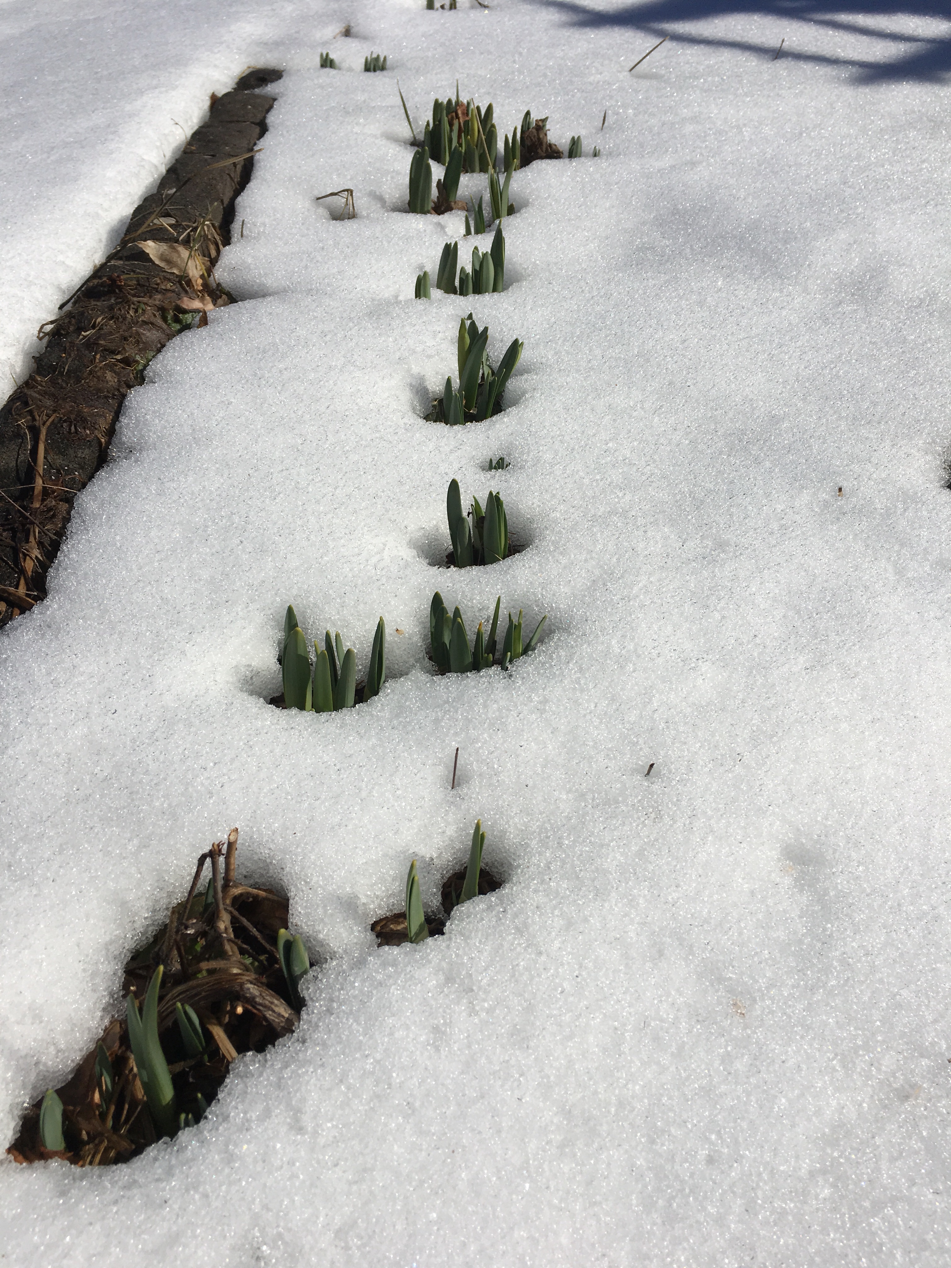 The front flower bed is mostly brown but there are a few signs of spring with Daffodils peaking through. they were covered in snow just a week ago.